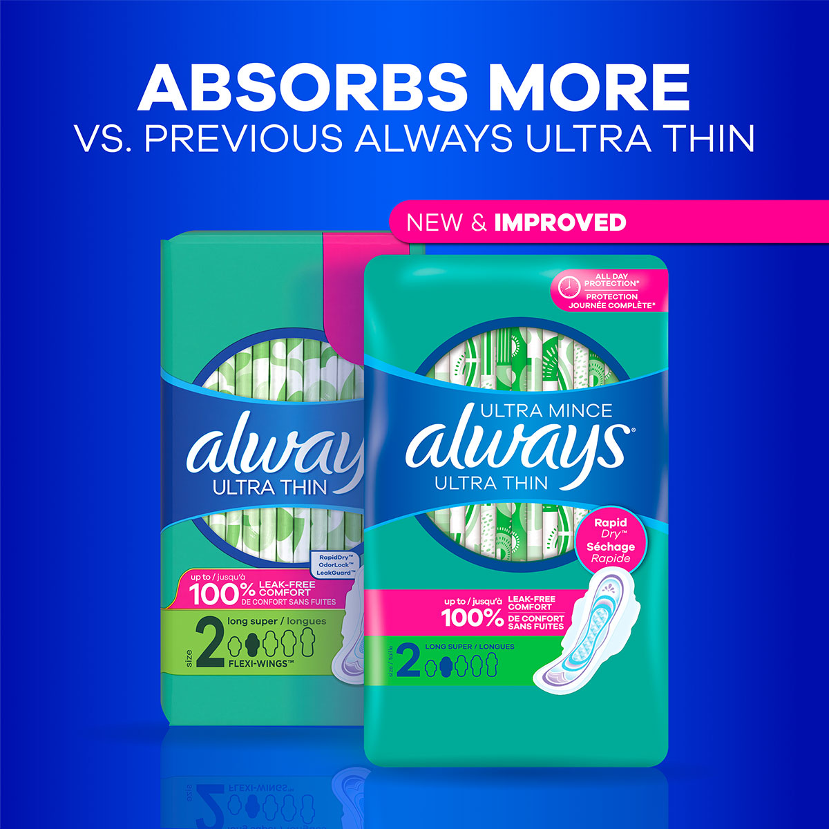 On your period, sudden gushes happen without any warning. But with Always Ultra Thin, you can now say “Goodbye” to stand up gush fears! All Always Ultra Thin Pads have our 3x Protection System to give you peace of mind day and night. RapidDRY technology absorbs gushes 2X faster than the leading store brand. The LeakGUARD core locks in leaks for long-lasting protection. Plus, OdorLOCK that helps prevent unwanted odors to help you feel fresh and clean throughout your day! Hello Clean and Comfortable! With Always Ultra Thin, Fear No Gush. Always Ultra Thin Pads come in a range of sizes from 1 to 5 to fit your flow and size perfectly. If you have a light flow or need a teen-sized pad, then we would recommend using our Always Ultra Thin size 1 to 3. If you have a heavy flow or want overnight protection, then we recommend using our size 4 or 5 Ultra Thin Pad. Additionally, all Always Ultra Thin packs are made of 50% recycled plastic. Remember that all Always Ultra Thin Pads are FSA & HSA eligible! Check with your FSA or HSA plan provider for information on the coverage of period care products.