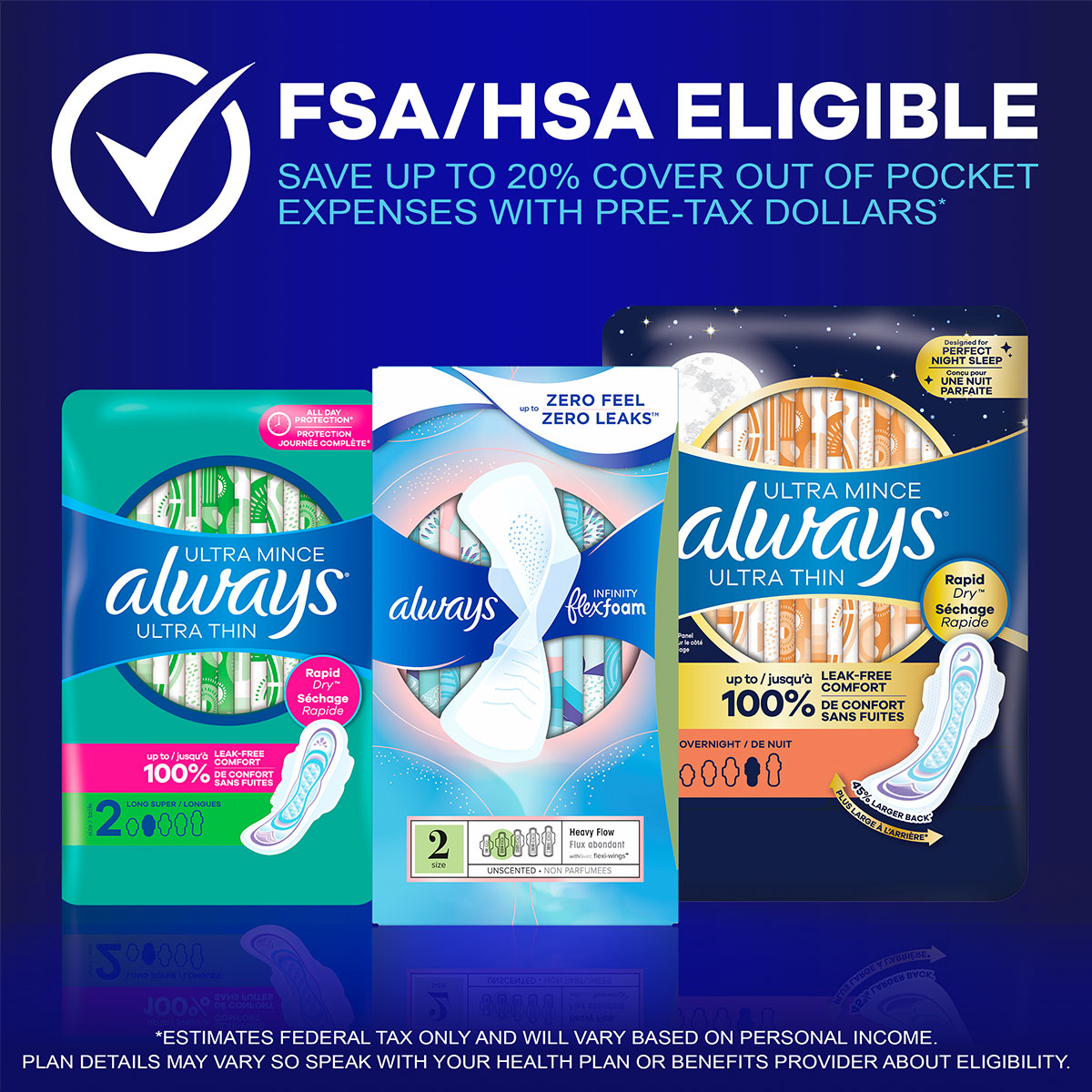 Always Ultra Thin Overnight Pads with Flexi-Wings provide you a PERFECT NIGHT SLEEP with 45% more coverage on the back for up to 100% Leak Free Comfort, no matter how you sleep. All Always Ultra Thin Pads have our 3x Protection System to give you peace of mind day and night. RapidDRY technology absorbs gushes 2X faster than the leading store brand. The LeakGUARD core locks in leaks for long-lasting protection. Plus, OdorLOCK that helps prevent unwanted odors to help you feel fresh and clean throughout your day! Plus Always Ultra Thin Pads come in a range of sizes from 1 to 5 to fit your flow and size perfectly. If you have a light flow or need a teen-sized pad, then we would recommend using our Always Ultra Thin size 1 to 3. If you have a heavy flow or want overnight protection, then we recommend using our size 4 or 5 Ultra Thin Pad. Additionally, all Always Ultra Thin packs are made of 50% recycled plastic. Remember that all Always Ultra Thin Pads are FSA & HSA eligible! Check with your FSA or HSA plan provider for information on the coverage of period care products.
